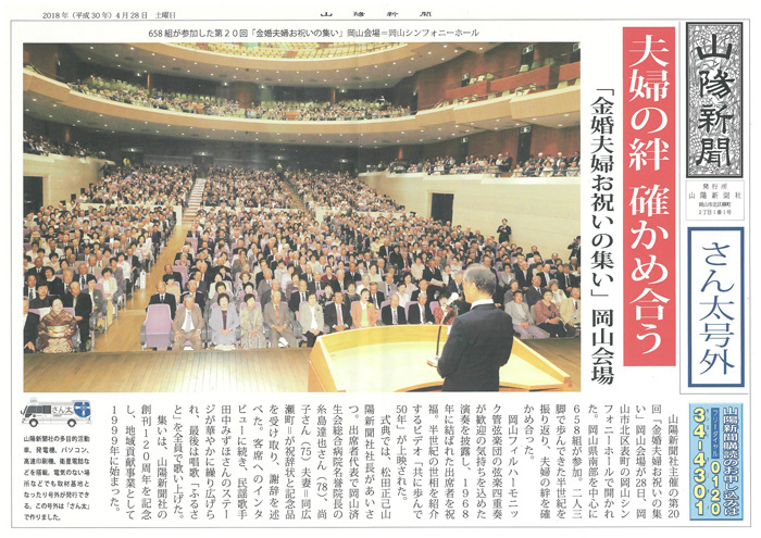 平成30年4月28日に山陽新聞社主催の第20回「金婚夫婦お祝いの集い」に参加してきました。岡山会場のシンフォニーホールに、658組1316名が集いました。