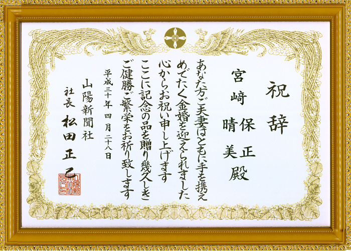 岡山フィルハーモニーの演奏で迎えられ、額装された「祝辞」、夫婦の写真、結婚した年の元旦の新聞、そして「さん太号外」としてこの会の記事をいただきました。