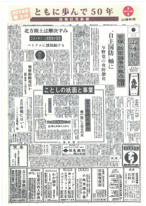 昭和43年4月 結婚して50年、一番思うこと 女房に出会えた運命、二番目は たまにする喧嘩で考え方の違いを、なるほどそんな考え方もあるかと納得すること、会社を起業して44年 女房なくして不可能、感謝・感謝、あと20年ほどよろしく。